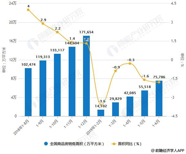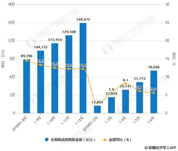 2018-2019年前6月全國商品房銷售面積、銷售金額統(tǒng)計(jì)及增長情況