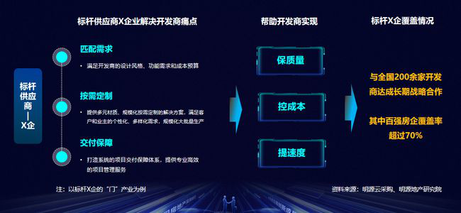 第二,聯(lián)合采購(gòu)或者說與“采購(gòu)聯(lián)盟”戰(zhàn)略合作,并基于此平臺(tái)實(shí)現(xiàn)與多家房企的流程對(duì)接。目前聯(lián)合采購(gòu)面臨的關(guān)鍵問題是,需要建立起一個(gè)從框架協(xié)議、合同簽訂、生產(chǎn)供貨到驗(yàn)收結(jié)算的一體化平臺(tái),這樣聯(lián)合采購(gòu)才會(huì)真正落到實(shí)處。